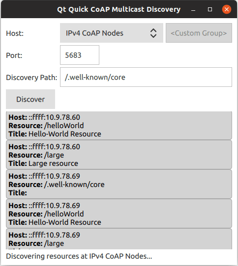 The Quick CoAP Multicast Discovery Example demonstrates how to register QCoapClient as a QML type and use it in a Qt Quick application for CoAP multicast resource discovery.