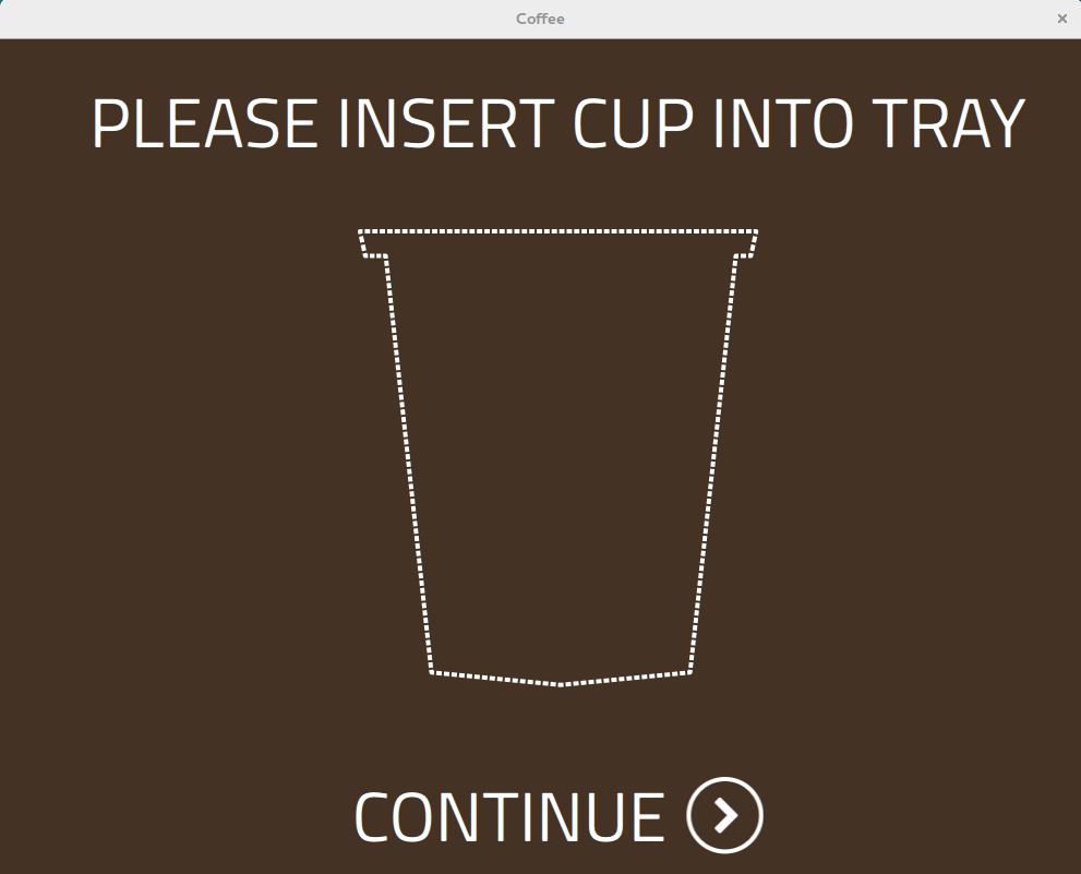 If you click on Brew, choosingCoffee.brewButton.onClicked() is triggered, which displays a screen with the message "Please insert cup into tray".