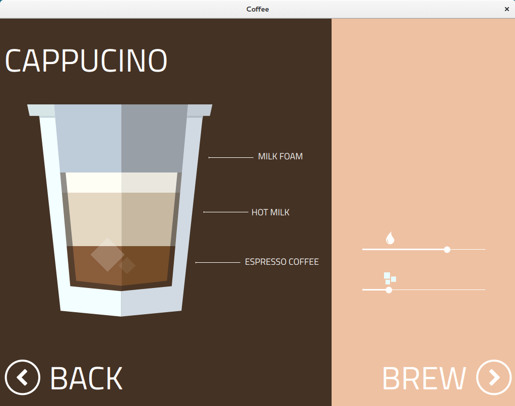 The coffee machine application lets you choose a type of coffee on the left side of the main screen. After selection, the app displays what the coffee blend will contain (ratio coffee/hot milk/milk foam). This can be modified with two sliders. When the brew has been started, the app shows an animated display of the brewing process, then returns to the start screen.