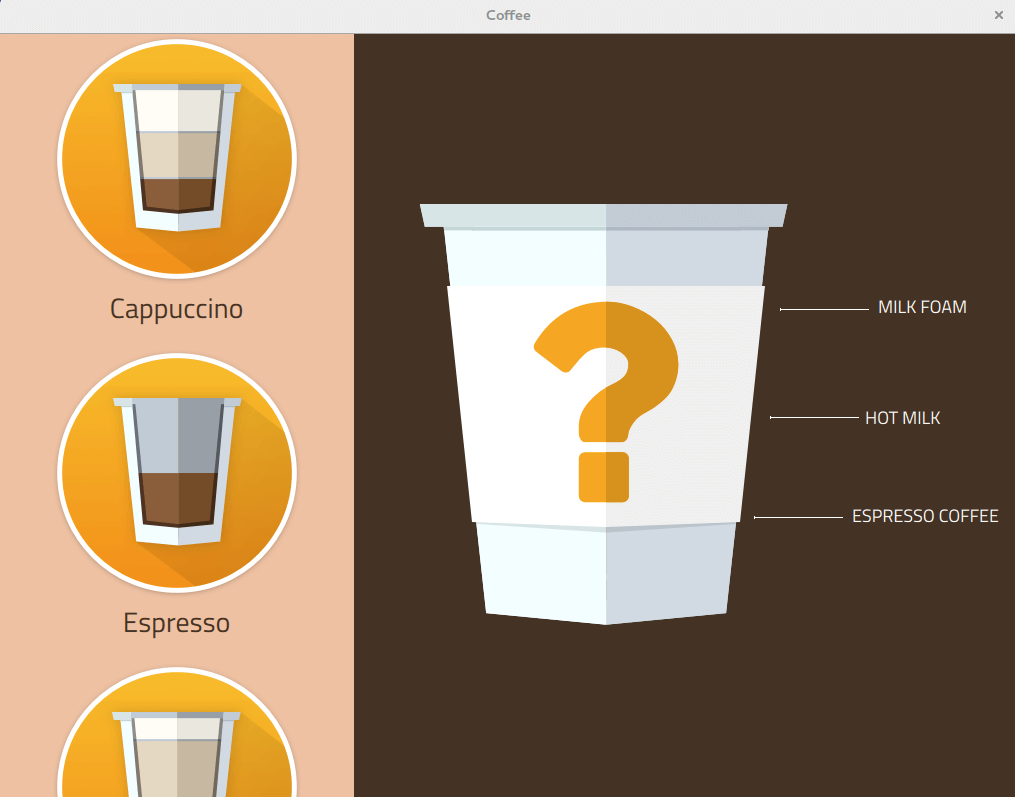 Selecting a coffee type - for example, cappuccino - triggers animation1 and animation2 in CoffeeButton.qml. On the right side, you will see the coffee blend you selected.