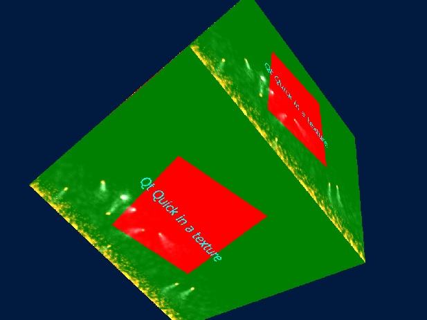 The cube is rendered directly with OpenGL, using Qt Gui enablers such as QWindow, QOpenGLContext, QOpenGLShaderProgram, and QOpenGLFunctions. The cube is textured with the texture that the Qt Quick render pass outputs to.