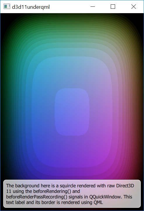 The example is equivalent in most ways to the OpenGL Under QML, Metal Under QML, and Vulkan Under QML examples, they all render the same custom content, just via different native APIs.