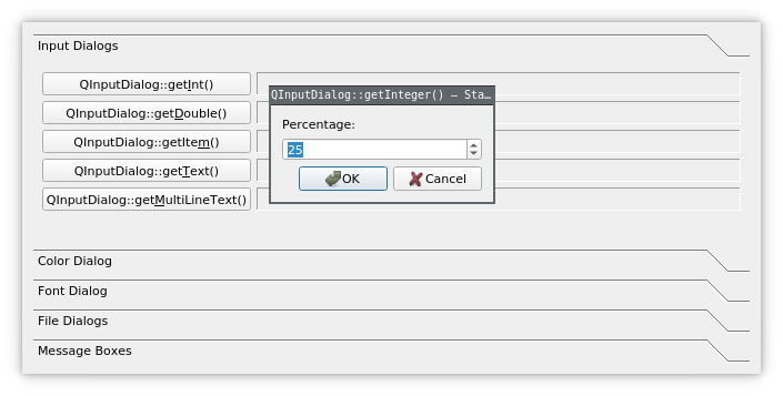 Standard Dialogs Example The Standard Dialogs example shows the standard dialogs that are provided by Qt. Article lu fois. L'auteur The Qt Company Ltd. L'article Publié le 27 décembre 2024 - Mis à jour le 27 décembre 2024 Liens sociaux Standard Dialogs Example▲ Example project▲ Example project @ code.qt.io Vous avez aimé ce tutoriel ? Alors partagez-le en cliquant sur les boutons suivants :